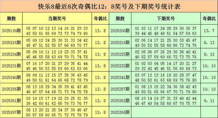 福彩快乐8第2025267期开奖回顾:08 13 20 21 25 34 37 39 45 47 50 57 58 60 65 71 72 75 78 79,其中奖号奇偶比为12:8,大小比为12:8,012路比为8:6:6。